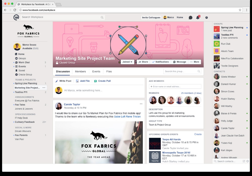 O “Workplace” oferece recursos familiares do Facebook como o Feed de notícias, Grupos, Messaging, Eventos e Transmissões ao vivo, bem como uma integração móvel permanente. E uma vez que o “Workplace” é fácil de usar, possibilita a integração e ligação de todos os funcionários, independentemente do local onde se encontram.