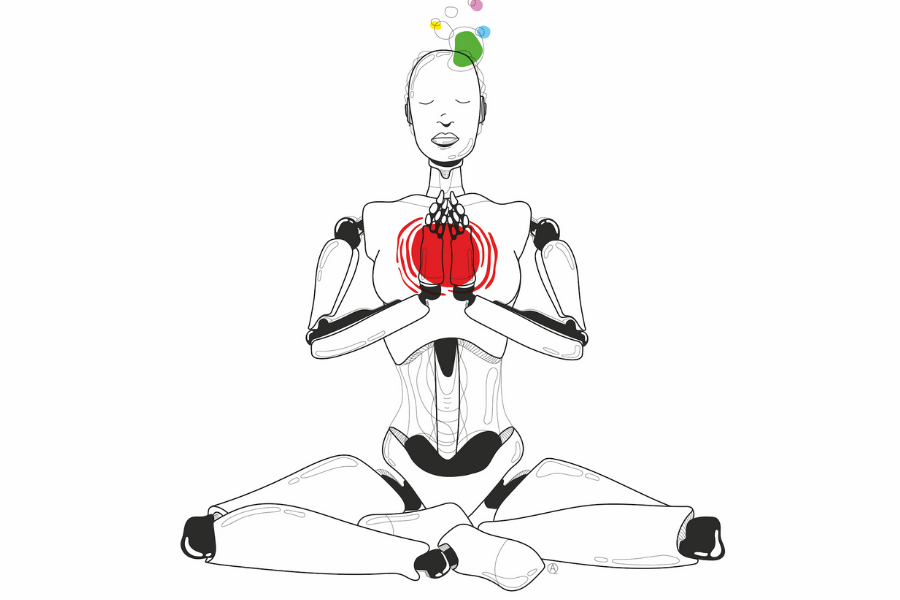 O filme de ficção científica de Spike Jonze, Her (2013), montado num futuro não tão distante, retrata um homem chamado Theodore Twombly (interpretado por Joaquin Phoenix), que se apaixona pela sua assistente virtual Samantha, artificialmente inteligente (interpretada por Scarlett Johansson). Numa sequência pungente, Samantha experiencia uma crise existencial e começa a questionar a realidade do seu amor por Theodore. Ela pergunta, “esses sentimentos são mesmo reais, ou são apenas programação?”. Para ajudar a responder a essa pergunta, Samantha junta-se a um coletivo de outros assistentes virtuais de IA para criar uma reencarnação – IA de Alan Watts, um dos mais importantes professores espirituais da década de 1970. A participação especial do líder espiritual gerado por computador incorpora uma das suas questões centrais: qual é a relação entre a inteligência artificial e a espiritualidade humana?
