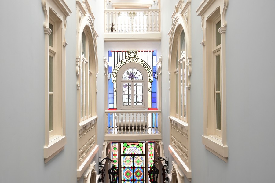 Mágico, porque os vários recantos, salas, salinhas, quartos e o encanto dos magníficos vitrais de cores intensas – que nos remetem para o séc. XVIII, assim como os azulejos setecentistas que remontam à reconstrução pombalina – nos levam a pensar que recuámos no tempo e estamos a viver uma outra vida.
